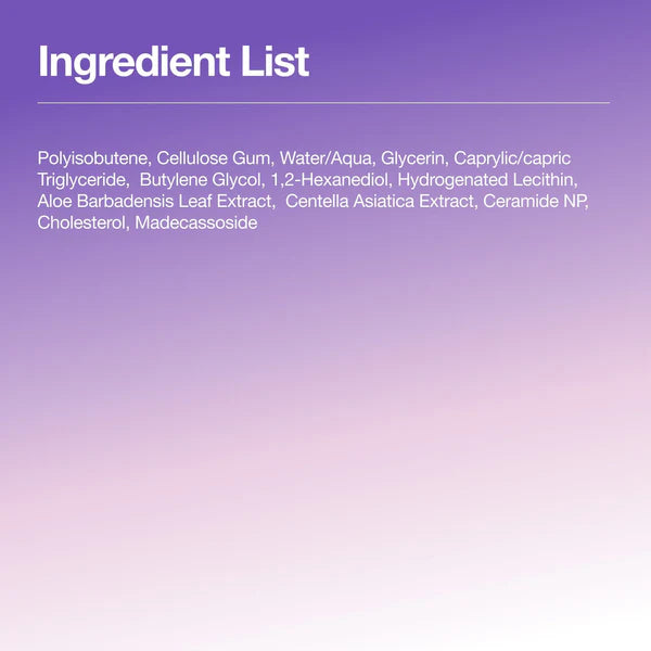 Polyisobutène, gomme de cellulose, eau, glycérine, triglycéride caprylique/caprique, butylène glycol, 1,2-hexanediol, lécithine hydrogénée, extrait de feuille d'Aloe Barbadensis, extrait de Centella Asiatica, céramide NP, cholestérol, madécassoside.