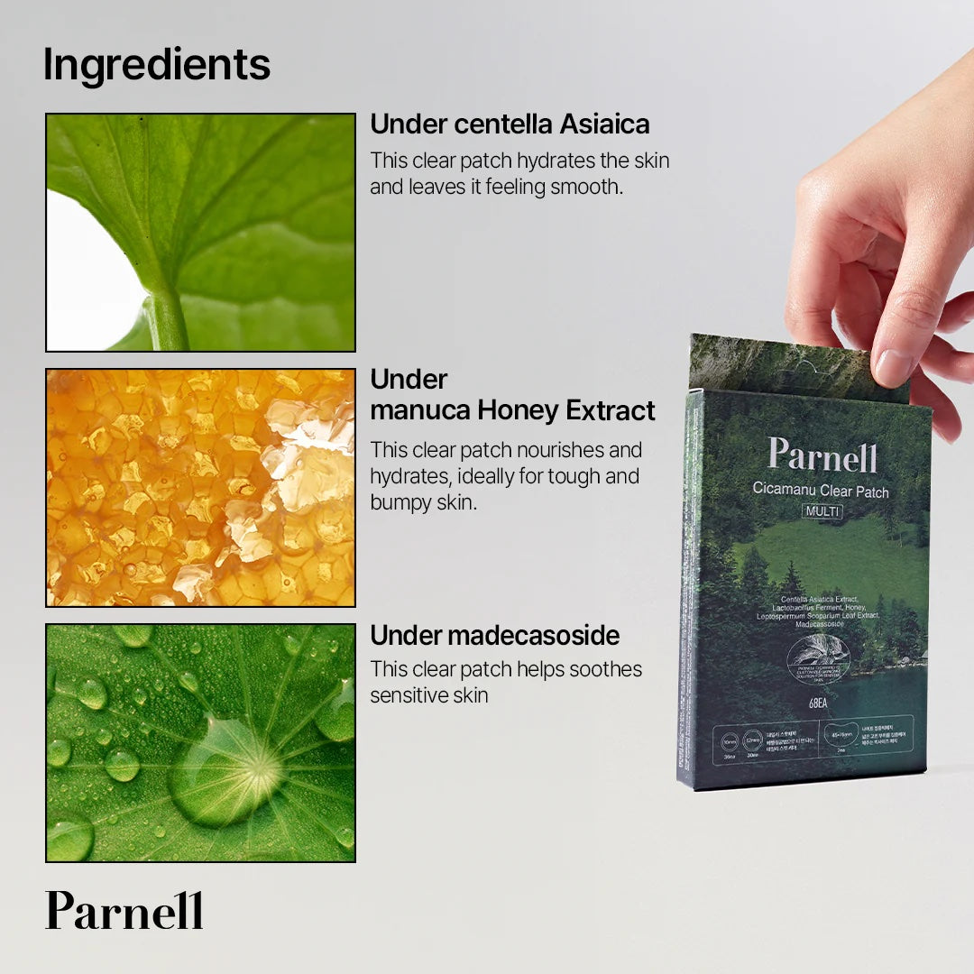 • Le biome Cicamanu™ du patch transparent Parnell Cicamanu apaise les zones sensibles, tandis que le tissu hydrocolloïde absorbe les sécrétions cicatricielles et maintient un environnement hydraté.
