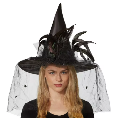 Avec ce magnifique chapeau, vous aurez le costume de sorcière le plus glamour. En satin, orné de plumes et de filet, c'est l'accessoire d'Halloween parfait. Taille unique.