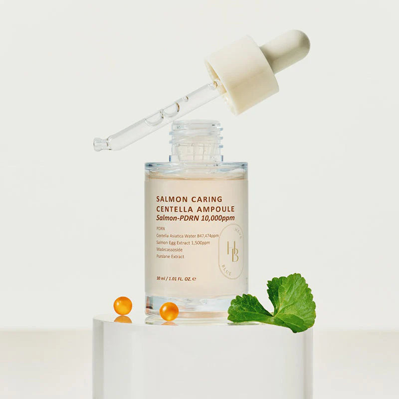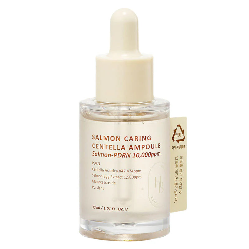 Heveblue Salmon Caring Centella Ampoule est formulée à base de PDRN de saumon, 847 474 ppm d’extrait de Centella Asiatica et de l’eau de Portulaca Oleracea pour booster l'hydratation de la peau et favoriser la régénération cellulaire.
