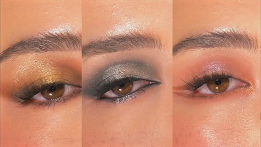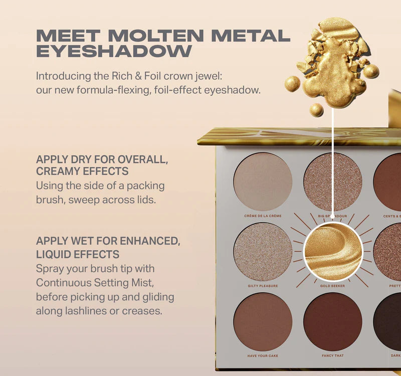 Créez votre look avec les riches teintes mates et chatoyantes, puis amplifiez-le avec le fard à paupières Molten Metal ultra-réfléchissant et flexible.