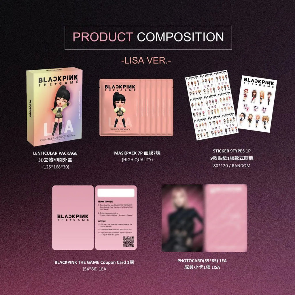Contenu : 7 masques en feuille K-beauty, 1 carte photo aléatoire, des autocollants officiels et une carte de coupon BLACKPINK The Game.