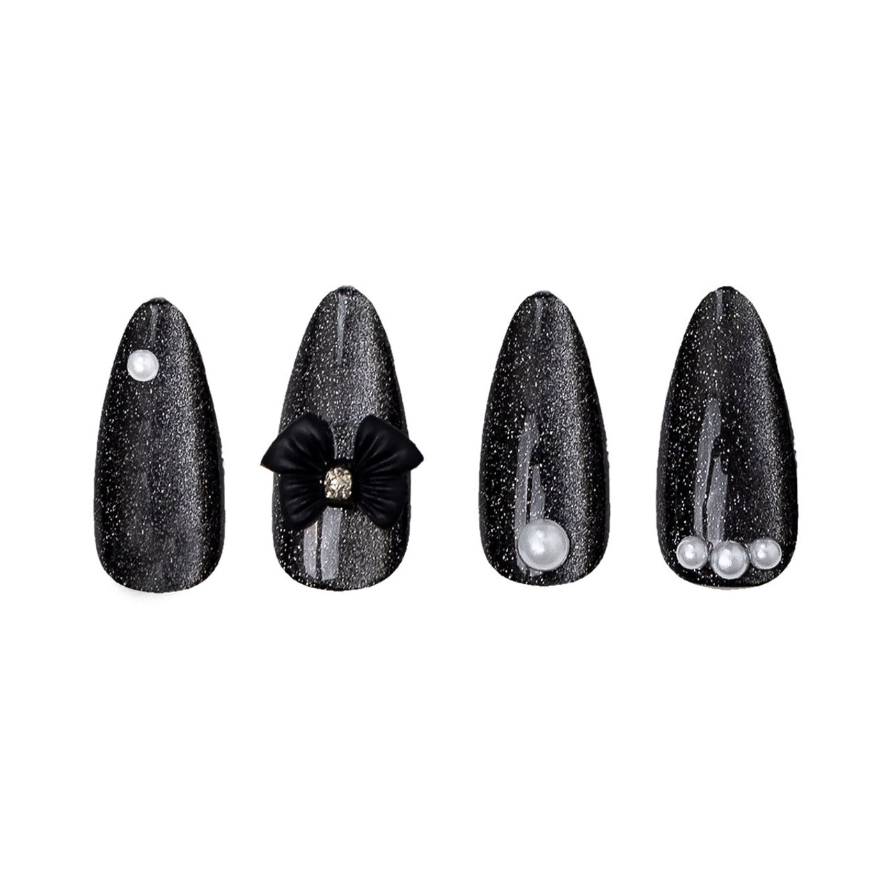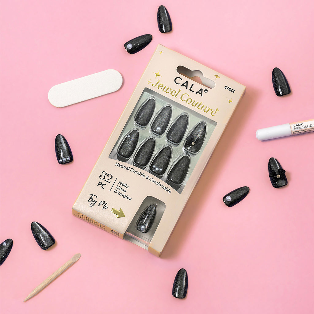 Ajoutez une touche d'originalité avec les faux ongles CALA® Jewel Couture en Ice Cat Eye : Noir . Ces luxueux faux ongles en amande arborent un chatoiement noir envoûtant, des ornements nacrés et un nœud noir 3D chic pour une touche à la fois audacieuse et élégante.
