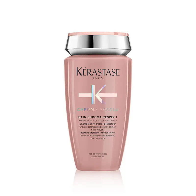 Le Bain Chroma Respect de la gamme Chroma Absolu de Kérastase est spécialement formulé pour les cheveux colorés sensibilisés ou abîmés, particulièrement ceux de texture fine à moyenne. Ce shampoing nettoie en douceur tout en hydratant intensément la fibre capillaire, réduisant ainsi la porosité et préservant l'intensité de la couleur*.